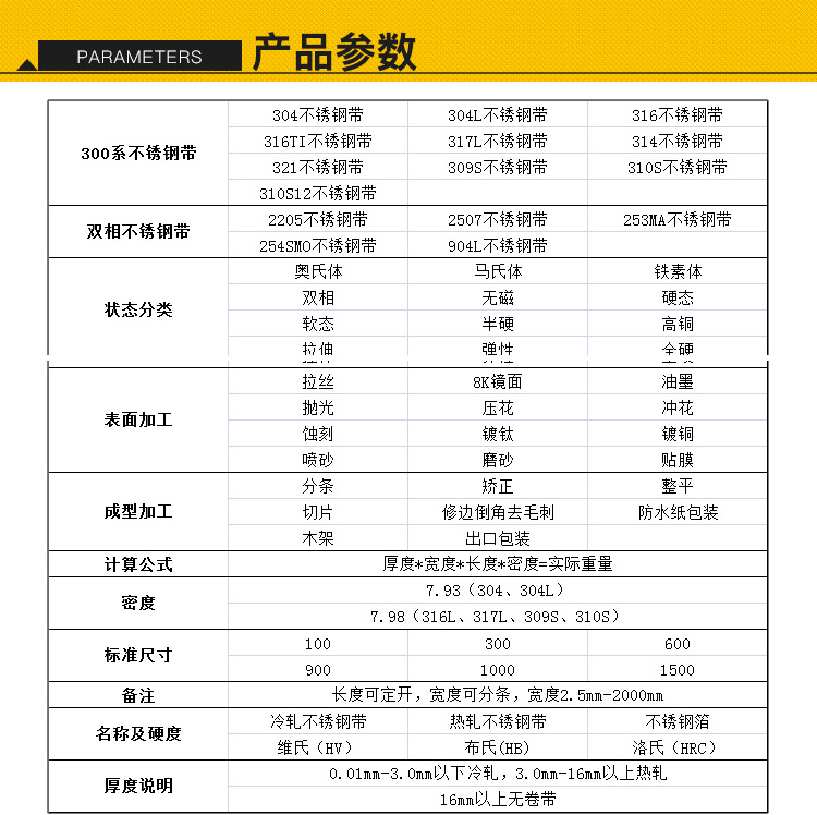 不銹鋼板材主要規(guī)格有:厚度0.1mm—4.0mm 寬度3.5mm—1800mm;剪割中厚板件,厚板度4mm—70mm,可剪割各種形狀。備注:可定做可切割可提供樣品,其他要求:可以提供材質(zhì)證明、SGS報告等。壓延硬料:(0.03mm---3mm) * (2mm-1520mm) * C