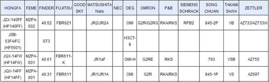 以繼電器為例,廈門宏發(fā)的繼電器產(chǎn)品能對(duì)富士通、歐姆龍、松下電工、松川等國(guó)際公司的產(chǎn)品進(jìn)行替代。具體可見下圖,如廈門宏發(fā)的JZX-140FF系列產(chǎn)品可以替代富士通FBR621、OMRON的G2R/G2RG、P&B的RKX/RKS系列產(chǎn)品等。
