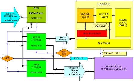 圖2:安森美半導(dǎo)體針對(duì)32英寸液晶電視的全橋高壓LIPS解決方案功能框圖。