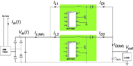 圖3:采用兩顆NCP1601 PFC控制器實(shí)現(xiàn)的交錯(cuò)式PFC架構(gòu)的功能框圖。