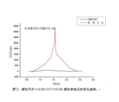 對于某些開關(guān),電流消耗甚至高達幾毫安,對功耗敏感的便攜式設(shè)備而言,這樣的功耗是無法接受的。大多數(shù)標(biāo)準(zhǔn)模擬開關(guān)的產(chǎn)品說明書只給出了典型情況下(即開關(guān)輸入控制信號的高電平與開關(guān)供電電壓一致)的功耗指標(biāo),這容易讓設(shè)計工程師感到混淆,他們會驚奇地發(fā)現(xiàn)在低壓ASIC設(shè)計中的模擬開關(guān)竟有幾毫安的漏電流。英聯(lián)電子的模擬開關(guān)改善了控制電路的輸入緩沖器,只要芯片的控制輸入電壓大于VIH或小于VIL內(nèi),而不是等于0V或VCC,也能保持非常小的功耗。從圖2可看到采用該技術(shù)的英聯(lián)電子UM3157模擬開關(guān)與普通的同系列模擬開關(guān)在ICCT上的顯著區(qū)別。 [page]