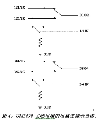 在音頻電路中,當(dāng)模擬開關(guān)斷開時,由于寄生電容和電容失配,電容上的電荷無法釋放,從而導(dǎo)致耳機上的噪聲??梢酝ㄟ^在開關(guān)斷開時接通一個去噪電阻,來快速釋放電荷,從而提高音頻切換質(zhì)量。圖4是英聯(lián)電子的UM3699在開關(guān)切換時去噪電阻的連接示意圖。