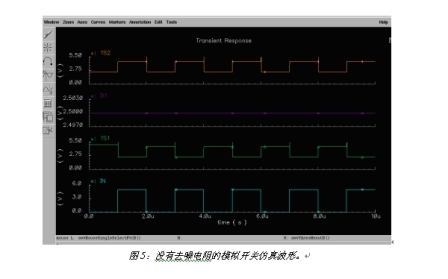 圖5是沒有采用去噪聲電阻時模擬開關(guān)的仿真波形圖。D1為輸入的數(shù)據(jù)信號。IN為選擇端信號。當(dāng)IN為高電平時,開關(guān)通向1S1;當(dāng)IN為低電平時,開關(guān)通向1S2。當(dāng)開關(guān)斷開時,由于寄生電容和選擇端切換脈沖的存在,開關(guān)到地之間是高阻態(tài),所以寄生電容的電荷沒有放電回路。這樣,開關(guān)的關(guān)斷端在較長的時間內(nèi)將出現(xiàn)一個比輸入數(shù)據(jù)信號更高的電平,從而導(dǎo)致噪聲。圖6是采用圖4中的去噪電阻后開關(guān)切換的仿真波形圖。由于開關(guān)斷開后連接了去噪電阻上,形成一個對地的放電回路,所以寄生電容上的電荷得以很快釋放,從而消除了開關(guān)切換時的干擾電平,提高了開關(guān)在音頻切換應(yīng)用時的聲音質(zhì)量。