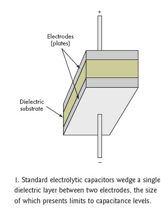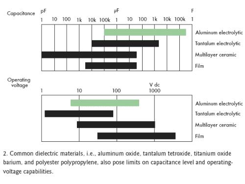 [page]標(biāo)準(zhǔn)電容的結(jié)構(gòu)是在兩個(gè)附屬于金屬板上的電極之間夾一層電介質(zhì)層(圖1)。根據(jù)電容類(lèi)型不同,電介質(zhì)可以是氧化鋁、四氧化鉭、氧化鈦鋇或聚丙烯聚酯,不同的材料決定了不同的容量和電壓特性(圖2)。電介質(zhì)的多少和極板間的距離也會(huì)影響電容量。然而,極板間最大允許距離限制了電介質(zhì)的數(shù)量。