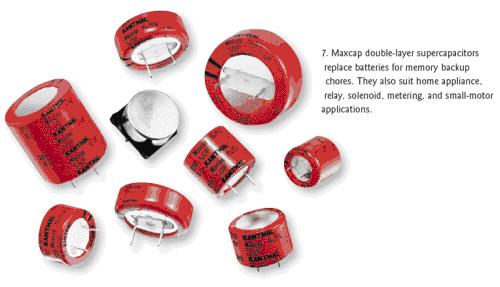 KanthalGlobar公司的Maxcap雙層電容器可以用來(lái)代替作為存儲(chǔ)器后備電源的電池,具有超過(guò)5.5F/in.3的容積效率、無(wú)限的服務(wù)壽命、快速充放電能力和非常低的漏電流等特性(圖7)。KanthalGlobar公司還表示,這些電容比電池更安全,在短路時(shí)不會(huì)爆炸,也不會(huì)損壞。這些電容器是非極化器件,不需要限流電阻或過(guò)壓保護(hù),因而可以消除裝配錯(cuò)誤和相關(guān)的成本。