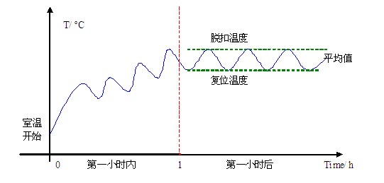 以單相馬達與自動復(fù)位熱保護器組合為例說明,其他情況請查閱相關(guān)標(biāo)準(zhǔn)。測試在室溫環(huán)境進行,堵轉(zhuǎn)72小時,其間熱保護器必須因繞組溫度升高斷開電路又自動復(fù)位,儀器連續(xù)記錄繞組溫度,圖-1的示意圖由經(jīng)驗所得。整個過程到結(jié)束,必須符合以下結(jié)果: