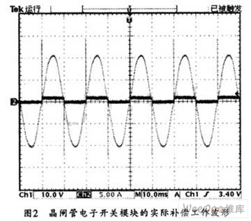 在無功補償實際應用中,可將晶閘管電子開關(guān)模塊用在TSC低壓無功補償以替代接觸器,這樣,就可以在開關(guān)電壓過零時投入補償電容量,從而避免了沖擊電流的產(chǎn)生和瞬間電網(wǎng)電壓的波動。圖2所示是其工作波形圖。