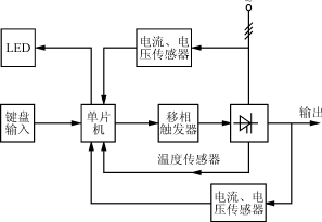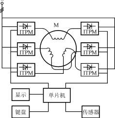 較為完整的ITPM一般由電力晶閘管,移相觸發(fā)器,軟件控制的單片機,電流、電壓、溫度傳感器以及操作鍵盤,LED或LCD顯示等部分組成。如圖1所示。