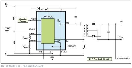 在高壓電源轉(zhuǎn)換電路設(shè)計中,諸如電源噪聲、開關(guān)頻率、開關(guān)損耗、電源體積、可靠性等問題一直是關(guān)鍵所在。與其它的高壓拓撲結(jié)構(gòu)相比,LLC轉(zhuǎn)換器因效率高且設(shè)計的電源體積小,在高壓電源適用領(lǐng)域一直受到設(shè)計師的青睞,不過其設(shè)計難度也非常大。Power Integrations公司(PI)不久推出的HiperLCS系列LCS700-708高壓LLC電源IC,將變頻控制器、高壓端和低壓端驅(qū)動器以及兩個MOSFET同時集成到了一個低成本封裝中,具有出色的設(shè)計靈活性,其最高負載效率超過97%,并利用高頻開關(guān)來減小變壓器的尺寸和輸出電容的占板面積,由此達到縮小電源尺寸的目的。圖1所示為HiperLCS功率級的電路簡圖,其中LLC諧振電感集成在變壓器中。變頻控制器通過零電壓(ZVS)開關(guān)功率MOSFET,消除開關(guān)損耗,從而達到高效率。