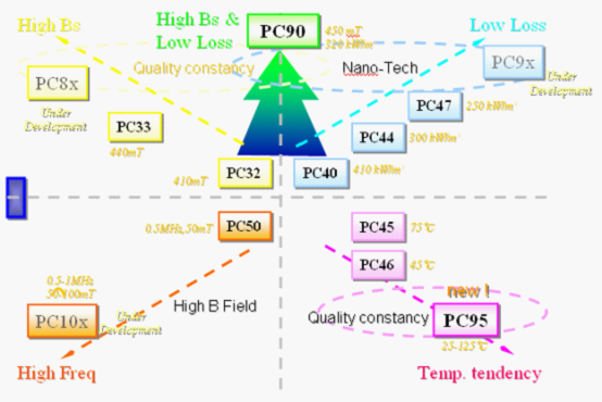 下面對(duì)高性能的材料做一個(gè)簡單介紹。LED變壓器的系統(tǒng)需要高飽和磁通密度和低損耗的特點(diǎn),TDK開發(fā)了一個(gè)PC47系列的變壓器材料,它的發(fā)展方向就是下圖箭頭所指的方向,縱軸是飽和度磁通密度和低損耗。這邊是我們對(duì)比市面一些通用的磁芯變壓器,和TDK現(xiàn)在所研發(fā)和不斷更新產(chǎn)品特性的比較。從右下角,粉紅色的點(diǎn)是目前市場上常用的一些材料的性能,橫坐標(biāo)是磁通量,縱坐標(biāo)是飽和的密度。我們可以發(fā)現(xiàn)從現(xiàn)在市場上這些粉紅色的點(diǎn)是在500Core Loss,磁通密度在380,跟TDK PC40材料是相當(dāng)?shù)?。PC47材已經(jīng)有很大的改善,在420的磁通密度,在250左右的Core Loss,也就是說相比通常所用的系列有比較大的改善。