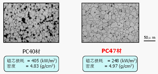 至于高性能材質(zhì)的研發(fā),設(shè)計(jì)的原理,材質(zhì)研發(fā)出來,它的密度更大。拿PC40材和PC47材兩個(gè)材質(zhì)高倍放大鏡成像的對(duì)比,可以發(fā)現(xiàn)左邊PC40材質(zhì)有很多黑色的點(diǎn)。那些點(diǎn)是間隙,粒子之間存在很多間隙。右邊PC47材質(zhì)黑點(diǎn)比PC40材小,也就是說PC47材密度會(huì)遠(yuǎn)遠(yuǎn)大于PC40材質(zhì),從而降低磁芯損耗,提高變換效率,降低發(fā)熱。基于材料開發(fā)及燒制因素(燒制方法、溫度條件)的最適度,實(shí)現(xiàn)材料的高密度設(shè)計(jì)。