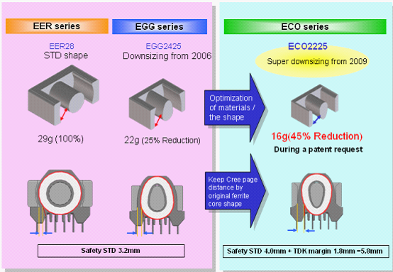 活用高性能材質(zhì)的優(yōu)點(diǎn),以EER28市面上最常用的一種變壓器型號(hào)分析。由于密度更大,我們可以使變壓器更輕、更小。比如在同樣功率的情況下,用高性能材質(zhì)體積和重量會(huì)比普通材質(zhì)更小。這邊僅以EER28為例,我們將以ECO2225系列可以取代市場上的EER28,重量有45%的消減。