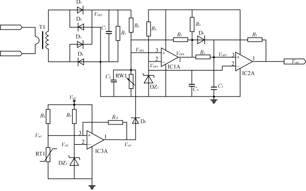 借助上述電路我們可以很容易地構(gòu)成,輸入過、欠壓保護,輸出過、欠壓保護,以及過熱保護。在此僅以附加過熱保護為例,說明如下:如圖1所示,過熱保護線路是由IC3A及其周邊元件組成。當電源的溫度沒有超過設(shè)定溫度時,Vot1<Vot2,運放IC3A的輸出電壓Vot3為低電平,由于有二極管D6的存在,此時IC3A的輸出電壓Vot3不會影響到VOP2的電壓,也就是說在過熱保護線路未起作用時,它不會影響到上述的過流保護線路的性能。當電源的溫度超溫時Vot1>Vot2,運放IC3A的輸出電壓Vot3變?yōu)楦唠娖?,通過二極管D6,使VOP2的電壓升高,從而觸發(fā)過流保護線路使電源進入停止工作期。只有當電源溫度降低到超溫保護點以下時,電源才能重新進入正常工作狀態(tài)。依此類推可以構(gòu)成其它輸入輸出過、欠壓保護線路。在此不再贅述。