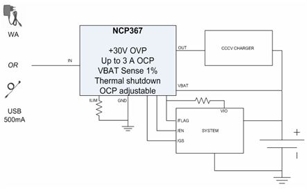 以NCP367為例,這是一款提供+30 V過壓保護(hù)及高達(dá)3 A過流保護(hù)、帶電池電壓檢測功能的保護(hù)IC(見圖5)。這器件保護(hù)便攜設(shè)備電池免受輸入過壓(在出現(xiàn)故障工作條件下會(huì)斷開系統(tǒng)與Vbus或AC-DC適配器的連接)、充電過流及充電過壓影響。NCP367提供最大值100 mΩ的低導(dǎo)通阻抗,幫助降低方案成本及電路板占用空間。支持高達(dá)3 A電流的能力幫助實(shí)現(xiàn)快速充電。典型值50 μA的極低電流消耗兼容于USB 500 μA閑置模式。這器件能用于1.5 A或500 mA兩種充電電流等級(jí),非常適合手機(jī)等應(yīng)用。