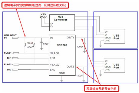 NCP382則是一款功率分配開關(guān),其設(shè)計(jì)針對很可能會(huì)遇到大的電容性負(fù)載或短路的應(yīng)用。實(shí)際上,越來越多便攜電子設(shè)備采用USB供電,但需要保護(hù)本地USB電源夠用受外部Vbus故障影響。NCP382能夠通過在輸出負(fù)載超過限流閾值或出現(xiàn)短路時(shí)切換至恒流模式,將輸出電流限制在期望的電平(0.5 A、1 A或1.5 A),從而提供過流保護(hù)。NCP381接收2.5 V至5.5 V的單路輸入,提供2路輸出。圖6是NCP382的典型應(yīng)用電路圖。