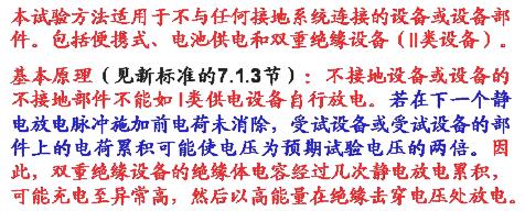 關(guān)于不接地設(shè)備的試驗(yàn)配置,新版標(biāo)準(zhǔn)與舊版標(biāo)準(zhǔn)的配置是相同的。關(guān)鍵是在單次放電時(無論是空氣的,還是接觸的),試品上的電荷應(yīng)當(dāng)在每次施加靜電放電脈沖之前先行釋放(釋放掉在需要施加靜電放電的金屬點(diǎn)或金屬部位上的電荷)。