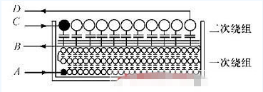 在開(kāi)關(guān)電源中,輸入整流后的電流為尖脈沖電流,開(kāi)關(guān)開(kāi)通和關(guān)斷時(shí)變換器中電壓、電流變化率很高,這些波形中含有豐富的高頻諧波。另外,在主開(kāi)關(guān)管開(kāi)關(guān)過(guò)程和整流二極管反向恢復(fù)過(guò)程中,電路的寄生電感、電容會(huì)發(fā)生高頻振蕩,以上這些都是電磁干擾的來(lái)源。開(kāi)關(guān)電源中存在大量的分布電容,這些分布電容給電磁干擾的傳遞提供了通路,如圖2所示。圖2中,LISN為線性阻抗穩(wěn)定網(wǎng)絡(luò),用于線路傳導(dǎo)干擾的測(cè)量。干擾信號(hào)通過(guò)導(dǎo)線、寄生電容等傳遞到變換器的輸入、輸出端,形成了傳導(dǎo)干擾。變壓器的各繞組之間也存在著大量的寄生電容,如圖3所示。圖3中,A、B、C、D4點(diǎn)與圖1中標(biāo)識(shí)的4點(diǎn)相對(duì)應(yīng)。