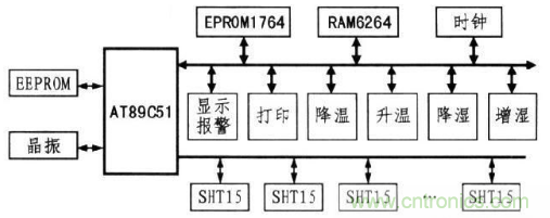 AT89C51和SHT15之間通過(guò)串行總線進(jìn)行通信。執(zhí)行機(jī)構(gòu)主要由電機(jī)控制的降溫機(jī)、升溫機(jī)、降濕機(jī)、增濕機(jī)等組成。彈藥倉(cāng)庫(kù)的溫/濕度監(jiān)控系統(tǒng)如圖3所示。