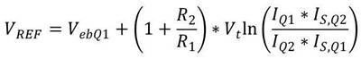 其中VEB是Q1的基射極間電壓,VT是熱電壓,IQ1和IQ2是通過(guò)晶體管Q1和Q2的電流,而 IS,Q1和IS,Q2則分別是Q1和Q2的飽和電流。