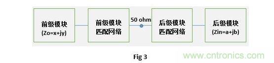 間接匹配,如Fig 3所示。把前級(jí)輸出阻抗和后級(jí)輸入阻抗,分別匹配到50ohm。這樣前后級(jí)就通過(guò)50ohm這個(gè)“中間人”匹配到了一起,這就是所謂的間接匹配。
