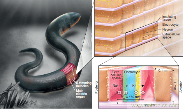 電鰻的所有放電體可以同時翻轉(zhuǎn),它們的微小電壓加起來就能產(chǎn)生強(qiáng)大的電能。
