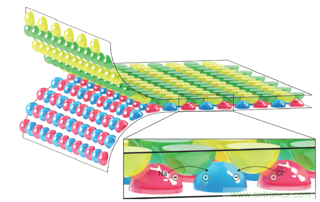 紅色凝膠含有鹽水,而藍(lán)色凝膠含有淡水。離子原本會從紅色凝膠流向藍(lán)色凝膠,但由于基板的間隔,無法出現(xiàn)這樣的流動。與此同時,與這塊基板對應(yīng)的另一塊基板上布置了綠色和黃色凝膠,當(dāng)它們橋接在藍(lán)色和紅色凝膠之間的空隙時,就能為離子運(yùn)動提供通道。