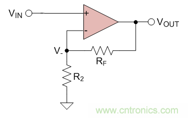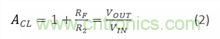 等式中A_CL是閉環(huán)增益,R_F 是反饋電阻值,而R_2 是從負輸入端到信號(反相)或接地(非反相)的電阻值。