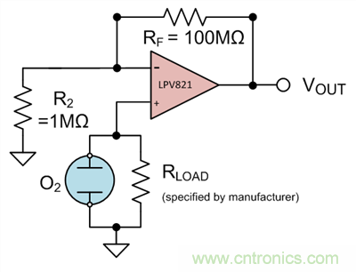 用氧氣傳感(見圖 3) 作為具體的應(yīng)用實例,假設(shè)感應(yīng)器的最大輸出電壓為10mV(通過制造商指定的負載電阻將電流轉(zhuǎn)換成電壓R_L) ,則運算放大器的滿量程輸出電壓為1V。通過Equation 2,可以看出 A_CL  的值需要為100,或者R_F是R_2的100倍。分別選擇100MΩ電阻和1MΩ電阻,得出增益值為101,且電阻值足夠大到可以限制電流并最小化功耗。