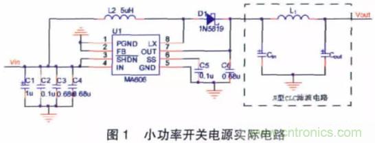 設(shè)計電路如圖1 所示,測試時輸入端使用3.6 V 的鋰電池進(jìn)行供電,使用π 型CLC 低通濾波電路對MAX606 輸出端進(jìn)行紋波濾波。
