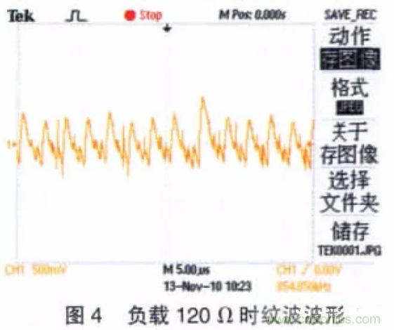 圖3 所示為空載時MAX606 輸出電壓紋波波形(Uo≈12 V),即開關(guān)紋波,其頻率為1.18 kHz,波形穩(wěn)定,Vpp=240 mV。圖4 所示為負(fù)載120 Ω 時輸出電壓的紋波波形,從圖4 中可以看出加入負(fù)載后電源紋波變得比較復(fù)雜,其最高Vpp達(dá)到1.2 V。為系統(tǒng)供電時,該紋波將會對系統(tǒng)造成嚴(yán)重危害,必須對此紋波進(jìn)行抑制。