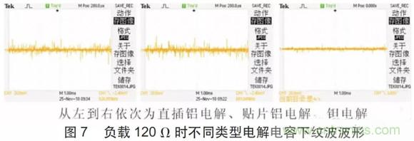 圖7 所示為負(fù)載120 Ω 時不同類型電解電容下所測量得到的紋波波形。對比圖4 可以看出,經(jīng)過π 型CLC 濾波后,紋波已被抑制到很小范圍。從圖7 可以看出,此時鉭電解電容的紋波抑制能力最好,紋波波形中毛刺幅度也變小。