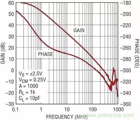 圖2:LTC6268的增益和相位隨頻率的變化