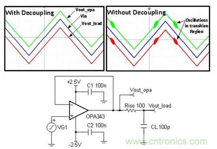 圖 1 為帶去耦電容器和不帶去耦電容器(C1 和C2)情況下用于驅(qū)動(dòng) R-C 負(fù)載的緩沖電路。我們注意到,在不使用去耦電容器的情況下,電路的輸出信號(hào)包含高頻 (3.8MHz) 振蕩。對(duì)于沒(méi)有去耦電容器的放大器而言,通常會(huì)出現(xiàn)穩(wěn)定性低、瞬態(tài)響應(yīng)差、啟動(dòng)出現(xiàn)故障以及其它多種異常問(wèn)題。