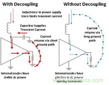 去耦電容與器件非常接近,因此電流路徑的電感很小。在暫態(tài)過(guò)程中,該電容器可在非常短的時(shí)間內(nèi)向器件提供超大量的電流。