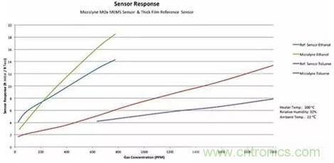 Micralyne對其MEMS MOS氣體傳感器的傳感響應(yīng),與傳統(tǒng)厚膜傳感器做了對比。在相對濕度32%,空氣中乙醇含量800ppm時,其MEMS MOS氣體傳感器達到和更大尺寸的厚膜傳感器(初始電阻和測試電阻比18:1)相近的靈敏度。對于所有的MOS傳感器,都必須考慮相對濕度,因為該參數(shù)也會影響傳感器的電阻變化。Micralyne的MEMS MOS氣體傳感器還可以探測600~2000 ppm的甲苯,初始電阻和測試電阻比高至8:1。其MEMS傳感器的響應(yīng)時間小于1秒。并且,在氣流中移除被分析氣體后,電阻恢復(fù)速度要比傳統(tǒng)厚膜氣體傳感器快2倍。