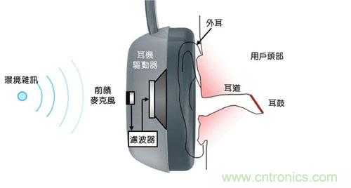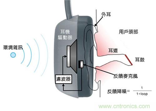 麥克風(fēng)偵測(cè)噪聲并透過(guò)濾波電路產(chǎn)生反相訊號(hào),在耳鼓處反相訊號(hào)與噪聲訊號(hào)抵消,從而降低人耳聽到的噪聲級(jí)。這里的濾波電路主要用來(lái)補(bǔ)償耳鼓和麥克風(fēng)處偵測(cè)到的噪聲之間差異,另外對(duì)于喇叭本身在降噪訊號(hào)的響應(yīng)能力方面也有補(bǔ)償作用。