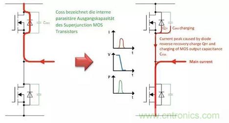 除了電阻損耗以外,開關(guān)損耗由兩種損耗機制決定:首先是存儲在續(xù)流二極管中的反向恢復(fù)電荷(Qrr),它導(dǎo)致激活的低邊開關(guān)晶體管導(dǎo)通出現(xiàn)電流峰值;其次是對阻塞高邊開關(guān)晶體管的輸出電容(COSS)進(jìn)行再充電時所流動的充電電流峰值。