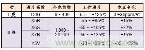 圖一,I類和II類MLCC的溫度特性和隨溫度的電容變化