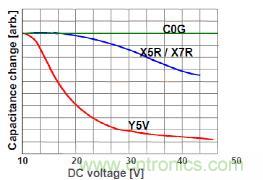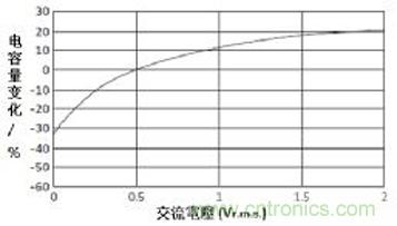 由于I類MLCC以順電材料組成,它的電容不會因交流電壓轉(zhuǎn)變而變化,但II類MLCC電容是隨著交流電壓的增加而變化。在II類MLCC中,Y5V顯示交流電壓的變化比X5R/X7R更嚴重,這是由于鐵電材料的電壓對極化曲線的非線性特性。