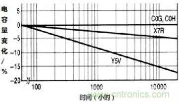 II類MLCC的電容量隨室溫中長時間放置呈對數(shù)關(guān)系減少,但I類MLCC由順電性質(zhì)的材料組成而不會有老化現(xiàn)象。老化本質(zhì)上是可逆的,但元件的老化是不能阻止的。在MLCC的試驗性能前,我們需要進行熱處理。即通過在居里點以上加熱(150℃至少1小時)并冷卻至室溫,將MLCC晶體結(jié)構(gòu)恢復(fù)到其最佳的無序排列,從而實現(xiàn)最大電容量。