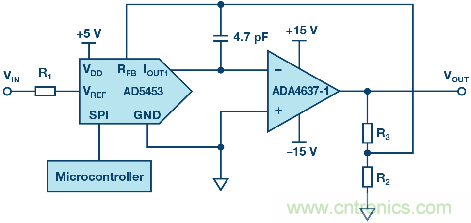 圖1顯示了一個(gè)帶下游放大器的14位MDAC AD5453 ,放大器可根據(jù)DAC的編程數(shù)字碼放大或削弱信號(hào)。