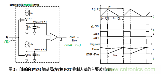 本文介紹一種創(chuàng)新的自適應(yīng)穩(wěn)壓器(AC/DC或DC/DC)脈寬調(diào)制器(PWM),基于“固定關(guān)斷時(shí)間(FOT)”或“恒定導(dǎo)通時(shí)間(COT)”控制方法,可以在全工況下(例如,滿負(fù)載CCM或中低負(fù)載DCM模式,寬輸入輸出電壓)以恒定開(kāi)關(guān)頻率工作,無(wú)轉(zhuǎn)換器的寄生參數(shù)(例如,功率開(kāi)關(guān)和濾波電感器的電阻)的負(fù)面影響。此外,本文提出的調(diào)制器電路與轉(zhuǎn)換器拓?fù)錈o(wú)關(guān)(升壓、降壓、反激式等),只與功率開(kāi)關(guān)管柵極驅(qū)動(dòng)邏輯信號(hào)(GD)有關(guān),節(jié)省芯片引腳數(shù)量,且/或降低設(shè)計(jì)復(fù)雜程度。