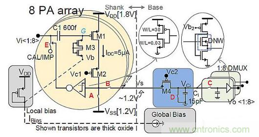 PA的面積受到電極大小的限制。其功率受限于可接受的組織加熱限制。噪聲需要比最小信號(hào)幅度(可能低至幾十微伏)更低。通常,降低噪聲的簡(jiǎn)單方法是為PA晶體管提供更多電流,這也將帶來(lái)更高帶寬。