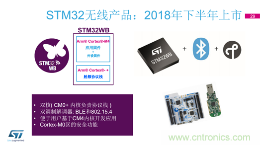 為應對日益復雜的物聯(lián)網(wǎng)協(xié)議及行業(yè)標準,STM32WB應運而生。作為STM32系列最重要的無線產品之一,STM32WB的“W”代表無線,“B”代表藍牙。它融合了STM32的生態(tài)系統(tǒng)和架構,以及開放射頻,擁有2個CPU、2個調制解調器和射頻收發(fā)器,能夠覆蓋更多的應用領域,特別是無線應用。STM32WB的雙核(CM0+ 內核負責協(xié)議棧)保留了Arm® Cortex®-M4部分,其復制了L4系列的架構,這意味著用過L4產品的開發(fā)商可以輕松使用STM32WB產品。而且STM32WB的部分產品樣片已經在今年2月份面世,預計到年底就能實現(xiàn)大規(guī)模上市。