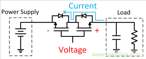 為了在FET關(guān)閉時阻斷兩個方向上的電流,你還可以將FET背靠背連接。與二極管解決方案相比,電源到負載的壓降更低,不過這種實現(xiàn)方式占用了大量的電路板面積。圖3顯示了用來阻斷反向電流的背靠背FET示例。