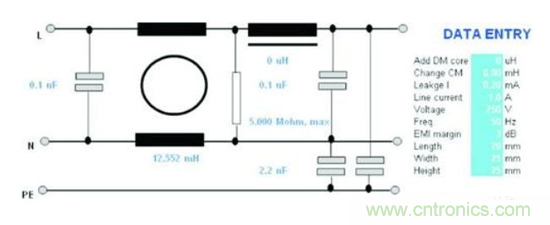 知道設備的干擾特性和輸入阻抗特性后,設計或者選擇一個濾波器就變得簡單了。如果使用一個現(xiàn)成的濾波器,可以調(diào)用過去積累的濾波器數(shù)據(jù)庫,比對濾波器參數(shù),找到一個合適的濾波器。如果沒有合適的或者想專門設計一個專用濾波器,可以借助專用的濾波器設計軟件。在確定一個濾波器模式后輸入濾波器一些簡單的約束條件,設計軟件根據(jù)阻抗特性自動計算出最合適的組件值,以及提供最合適的衰減。(如圖6所示)