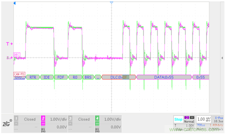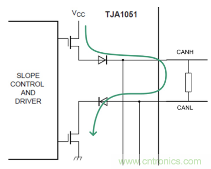 總線固有的差分傳輸形式使得CAN對于共模干擾有很好的抑制能力,如圖 4所示,通過CANH、CANL相減可很好地消除來自外部的共模干擾,但CANH、CANL并非理想對稱,快速上升的跳變沿,這些均會帶來EMC問題。我們通過示波器看總線波形很完美,測試靜電,EFT,浪涌,傳導騷擾抗擾均無異常。但測試傳導發(fā)射,則不能滿足限值要求,看起來很正常的總線實際卻向外在發(fā)送傳導干擾。