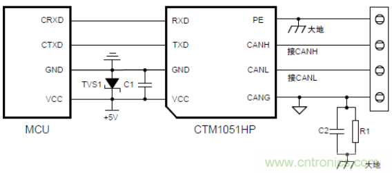 ZLG致遠電子基于多年的總線防護設計積累推出了高防護等級隔離模塊——CTM1051(A)HP系列。該系列符合國際ISO11898-2標準,靜電防護等級可達接觸±8kV,空氣放電±15kV,浪涌防護可達±4kV隔離CAN解決方案,具體如下圖7所示,能夠適用于各種惡劣的工業(yè)現(xiàn)場環(huán)境。應用簡便,即插即用,應用原理圖如下圖8所示。