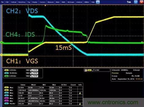 在電池保持板PCM過(guò)流關(guān)斷的過(guò)程中,從波形可以看到:功率MOSFET同樣也有較長(zhǎng)的一段時(shí)間工作于線性區(qū)。