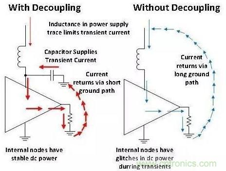 除了使用去耦電容器外,您還要在去耦電容器、電源和接地端之間采取較短的低阻抗連接。圖3將良好的去耦合板面布局與糟糕的布局進(jìn)行了對(duì)比。您應(yīng)始終嘗試著讓去耦合連接保持較短的距離,同時(shí)避免在去耦合路徑中出現(xiàn)通孔,原因是通孔會(huì)增加電感。大部分產(chǎn)品說明書都會(huì)給出去耦合電容器的推薦值。如果沒有給出,則可以使用0.1uF。